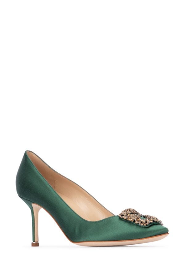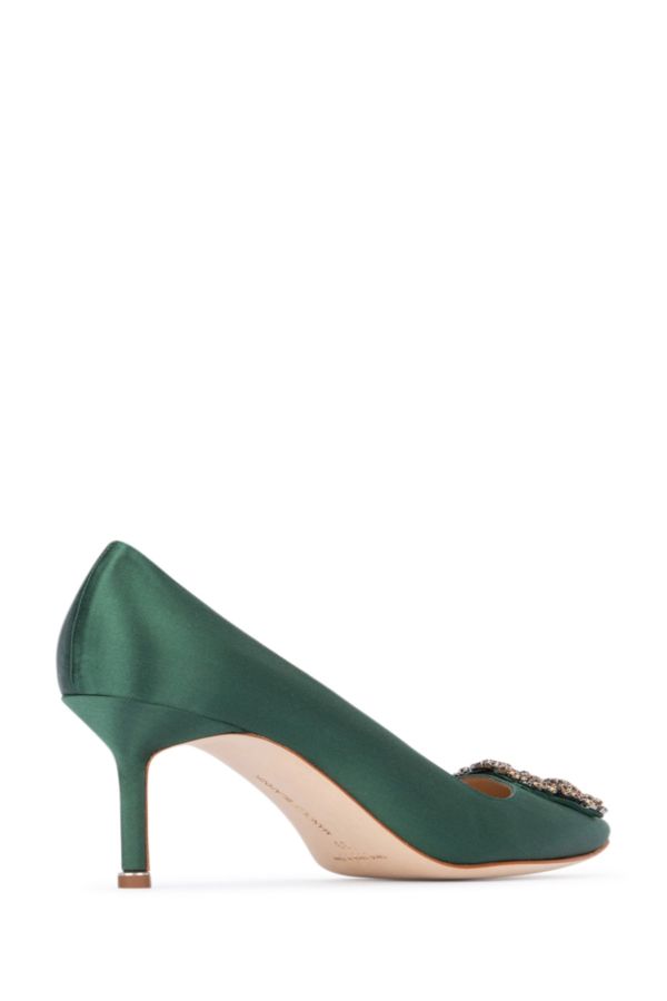 MANOLO BLAHNIK Hangisi heeled shoes in bottle green satin 70